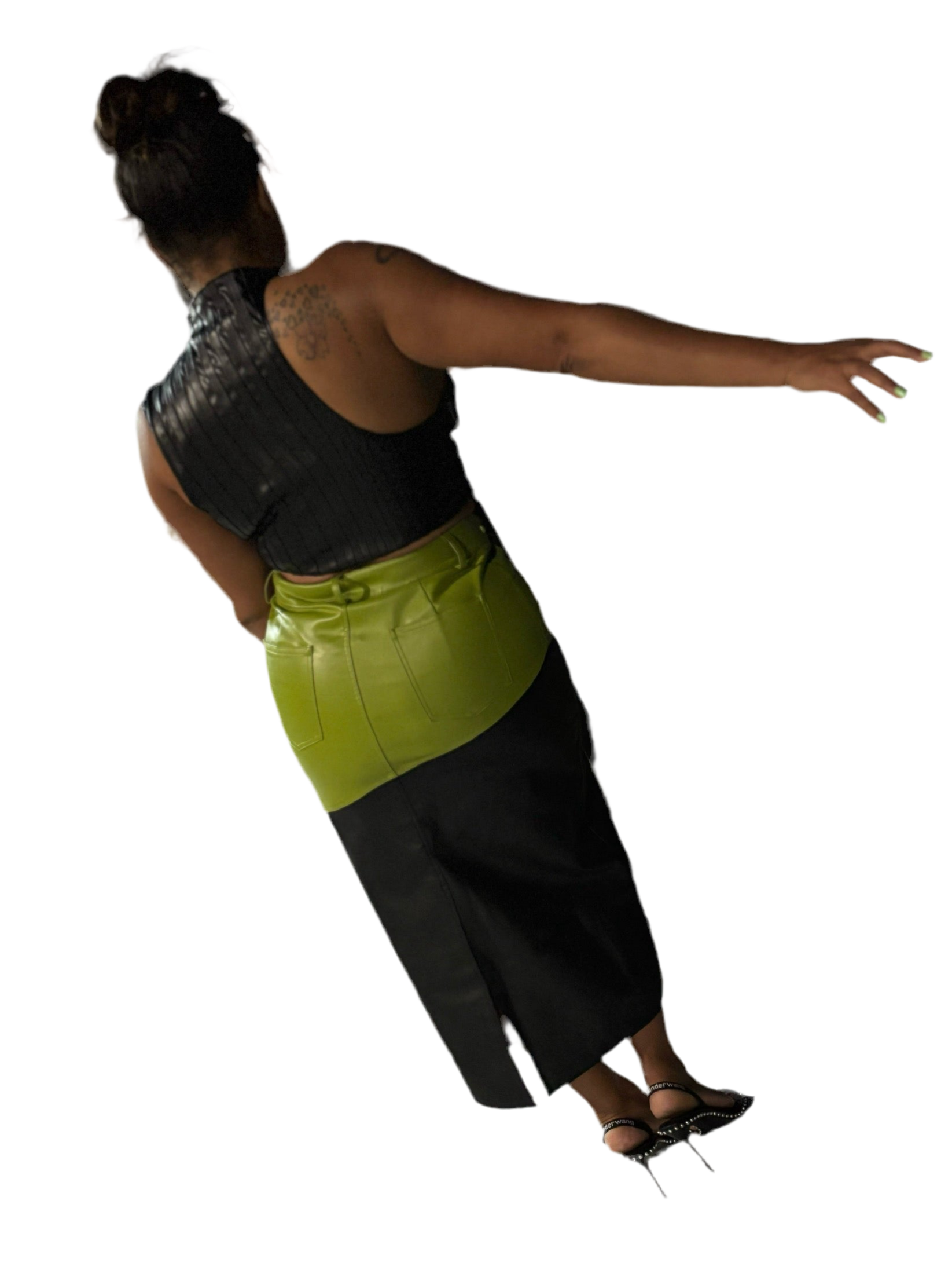 This color-blocked vegan leather skirt combines bold green and black panels for a modern, edgy look. It features convenient pockets and a stylish slit in the back, adding both functionality and a hint of allure. Perfect for making a statement, this skirt is versatile enough for both casual and dressy occasions.